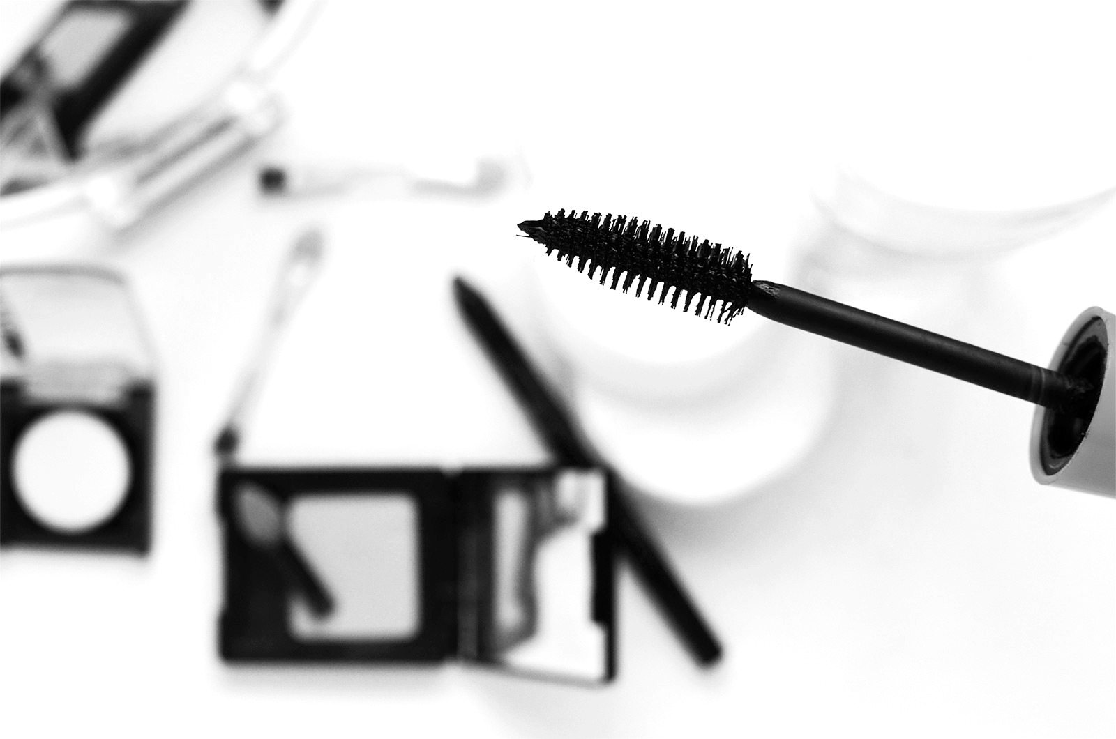 Escova de rímel ao alto com produtos de maquilhagem desfocados ao fundo